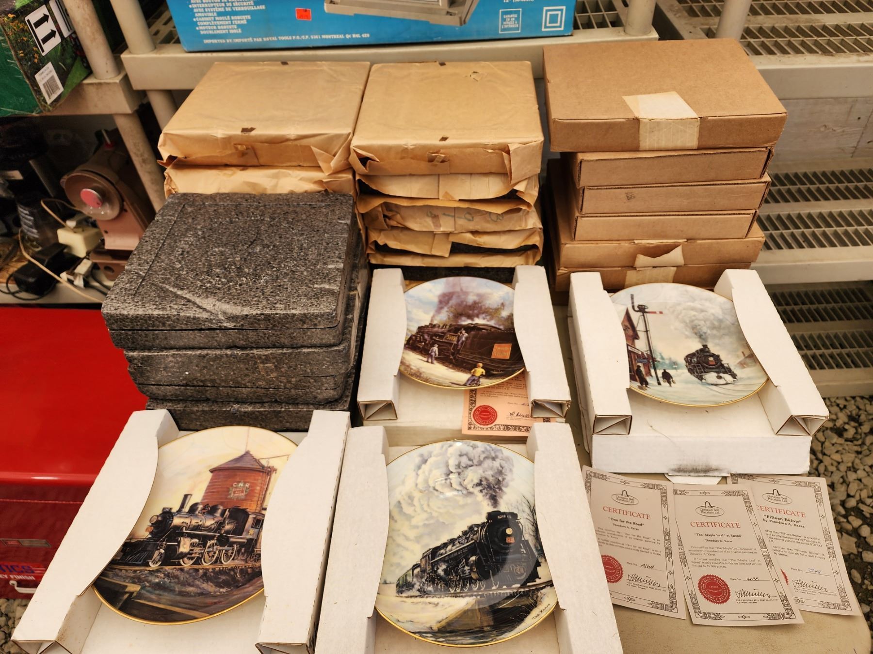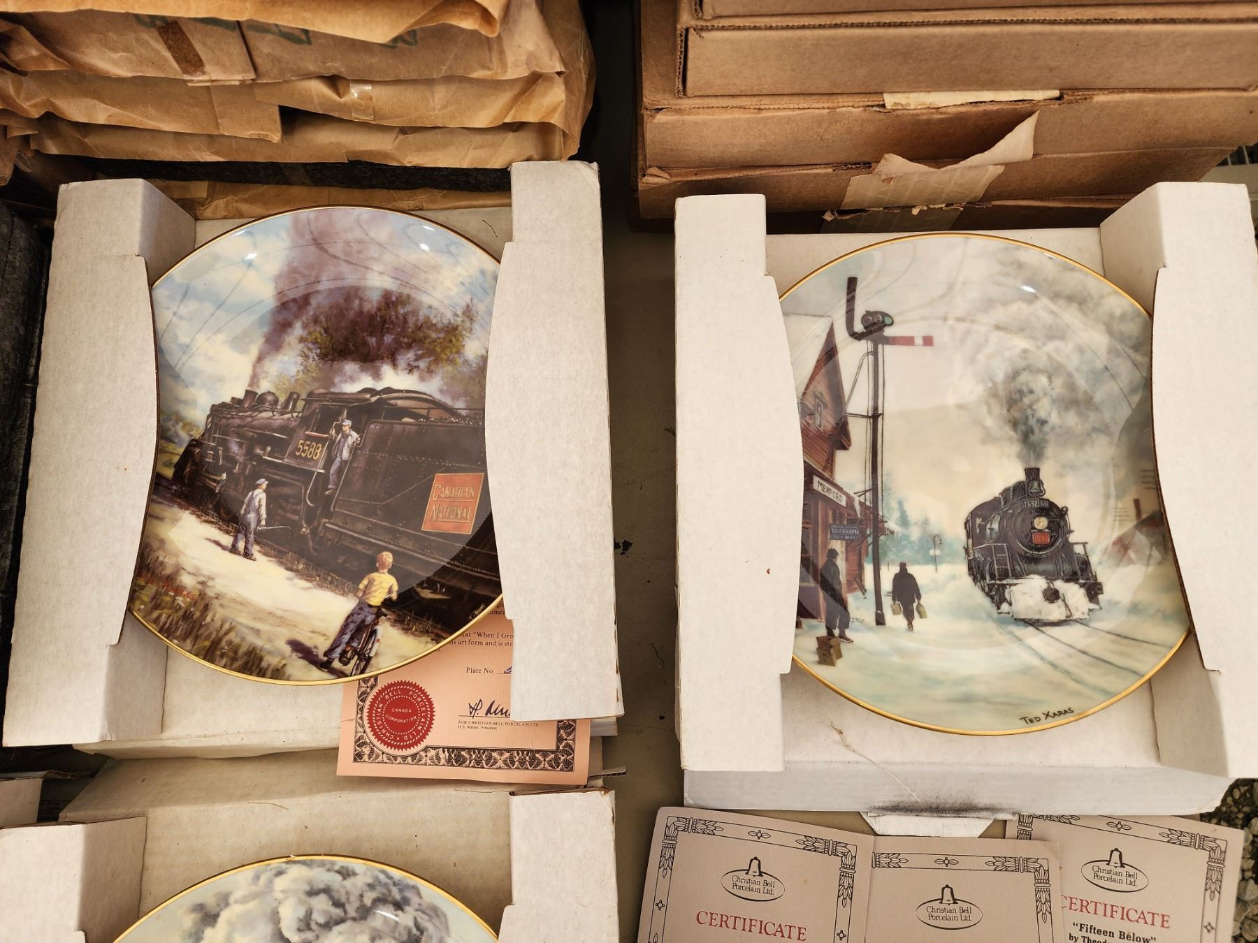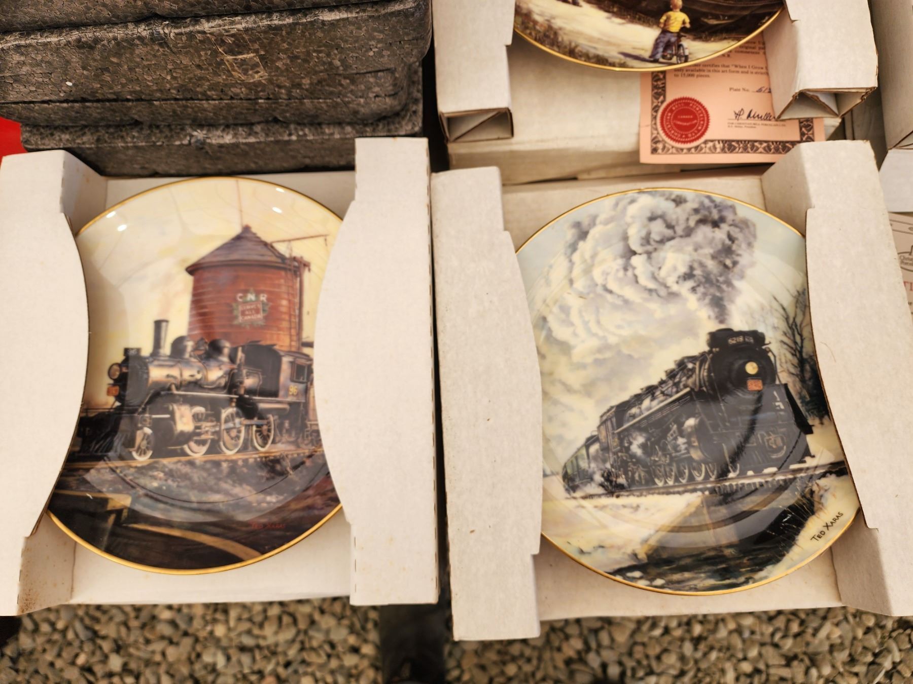 LARGE COLLECTION OF COLLECTABLE HAND PAINTED PLATES (CHRISTIAN BELL PORCELAIN TRAIN PLATES, ANCIENT ELEMENTS FULL SET WITH EXTRAS, AND NOTABLE FRENCH ARCHITECTURE PLATES)