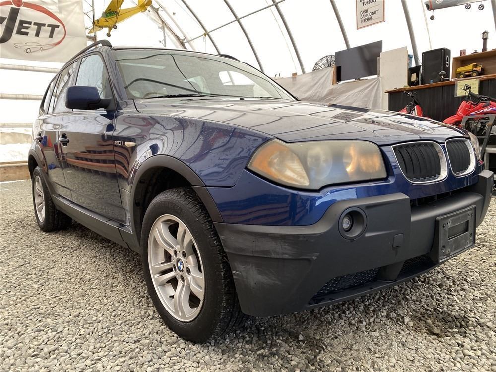 2004 BMW X3, BLUE, 229413 KMS, 3.0L, 6 CYLINDER, GAS, AUTOMATIC WITH TIPTRONIC, TRANSMISSION, ALL WHEEL DRIVE, 5 PASSENGER. AIR CONDITIONING, POWER WINDOWS, POWER LOCKS, KEY-LESS ENTRY, TILT STEERING, CRUISE CONTROL, ALLOY WHEELS, ANTI THEFT, DUAL AIR BAGS, POWER SUNROOF, CD PLAYER, BLUETOOTH, LEATHER SEATS, POWER SEATS, HEATED SEATS, MEMORY SEATS, TRACTION CONTROL, STEERING WHEEL CONTROLS, FOG LIGHTS, ROOF RACK, POWER MIRRORS, CHIP OR CRACK IN WINDSHIELD, SPLIT-FOLDING REAR SEATS. DECLARATIONS: EX-USA SPEEPOMETER INOP, NOT MECHANICALLY INSPECTED, NOT SUITABLE FOR TRANSPORTATION. MUST TOW.2 ACCIDENTS 0 GLASS CLAIM, TOTALING $6872. GOOD SERVICE HISTORY, CARFAX SHOWING 22 RECORDS.