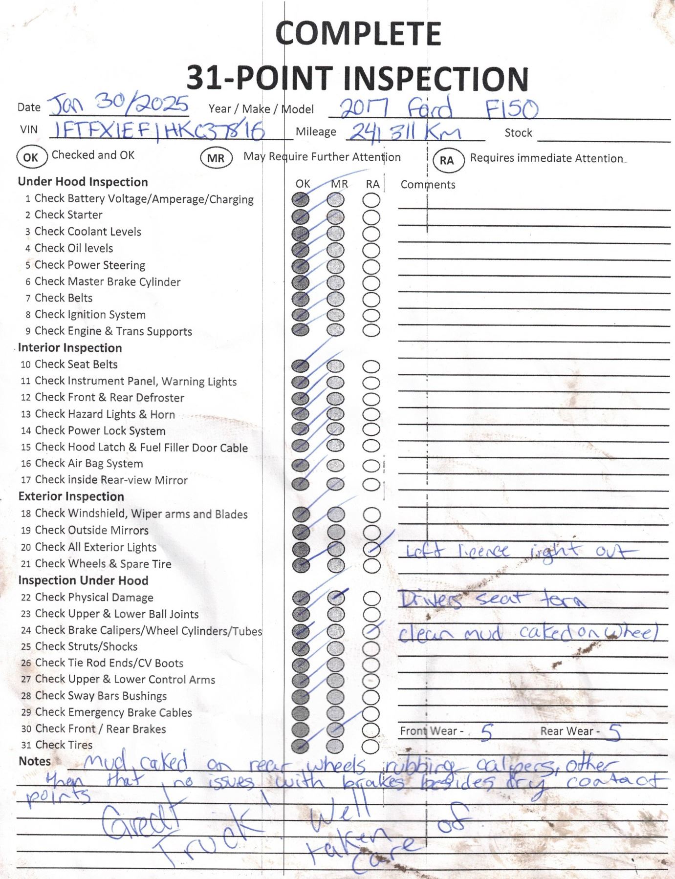 2017 FORD F-150 241306 KMS 5.0L V-SHAPED AUTOMATIC GASOLINE 4WD 5 PASSENGERS AIR CONDITIONING, POWER WINDOWS, POWER LOCKS, POWER MIRRORS, DUAL AIR BAGS, KEY-LESS ENTRY, CRUISE CONTROL, TILT STEERING, STEERING WHEEL CONTROLS, TRACTION CONTROL, ANTI THEFT, BLUETOOTH EX-OUT OF PROVINCE, EX-COMMERCIAL DESIGNATIONS 1 ACCIDENT 0 GLASS CLAIM TOTALING $ 0 42 RECORDS OF SERVICE