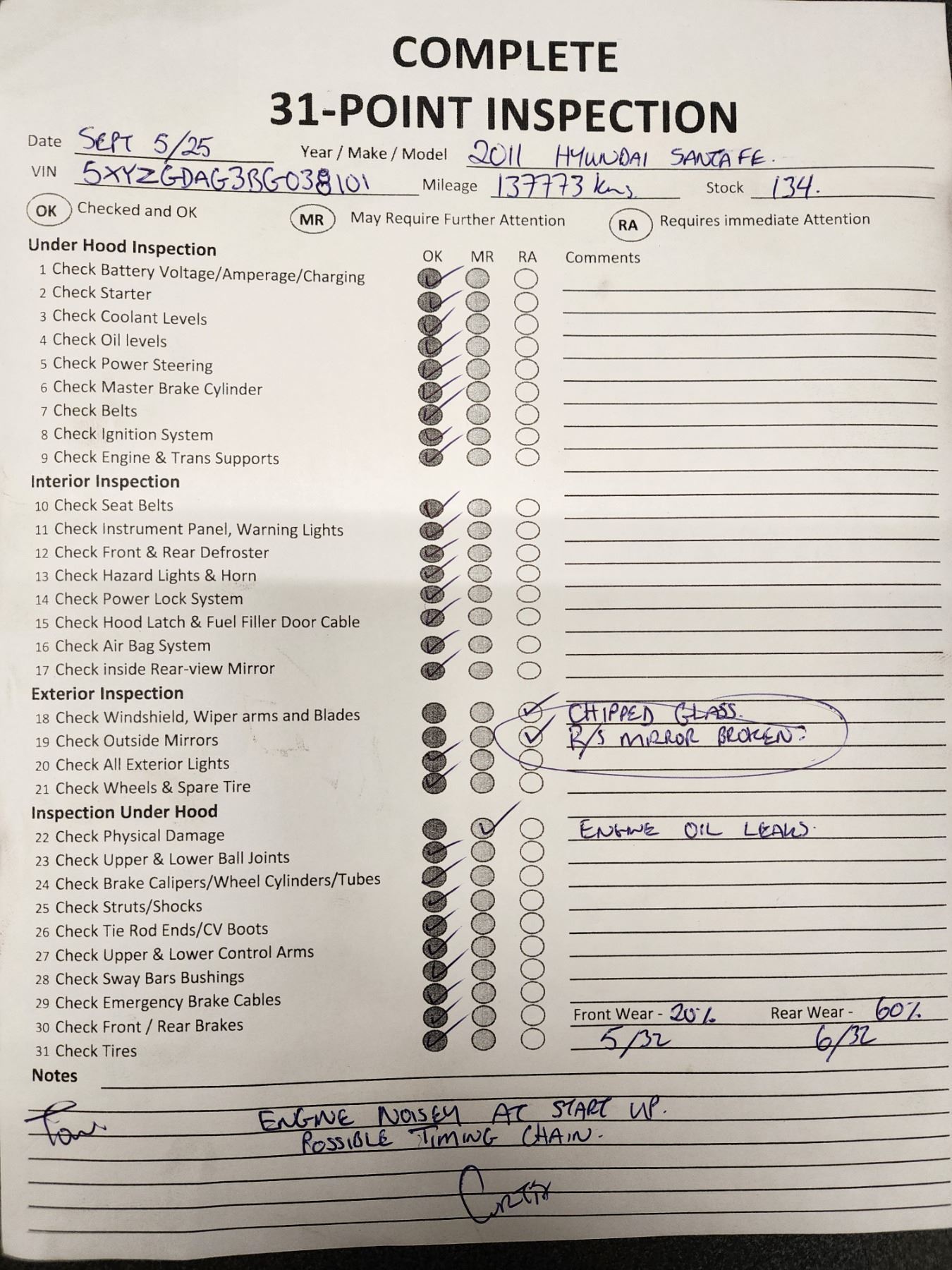 j) Any engines smoking or blow by, noisy lifters, head gaskets and camshaft exceeding 96,000 kms.