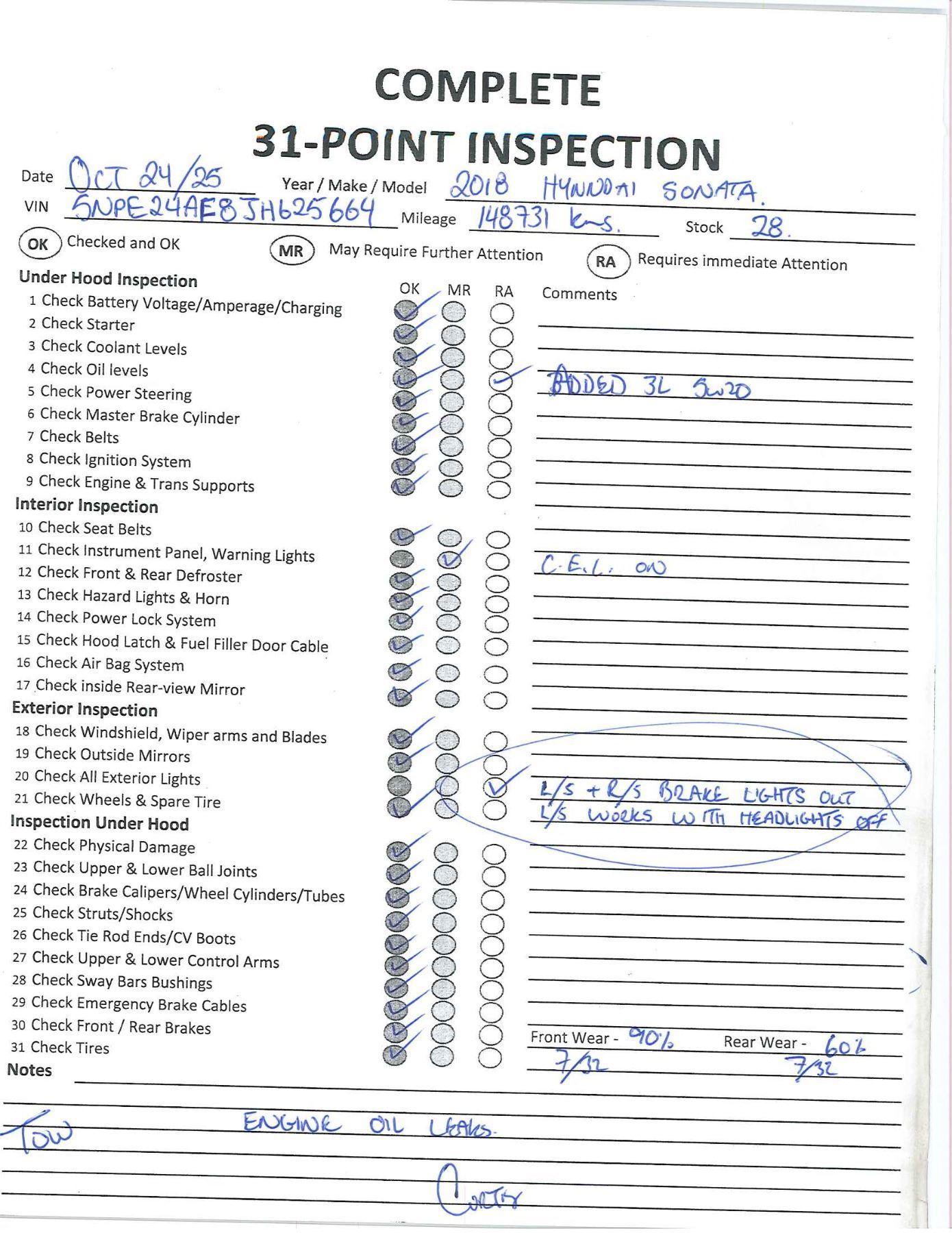 j) Any engines smoking or blow by, noisy lifters, head gaskets and camshaft exceeding 96,000 kms.